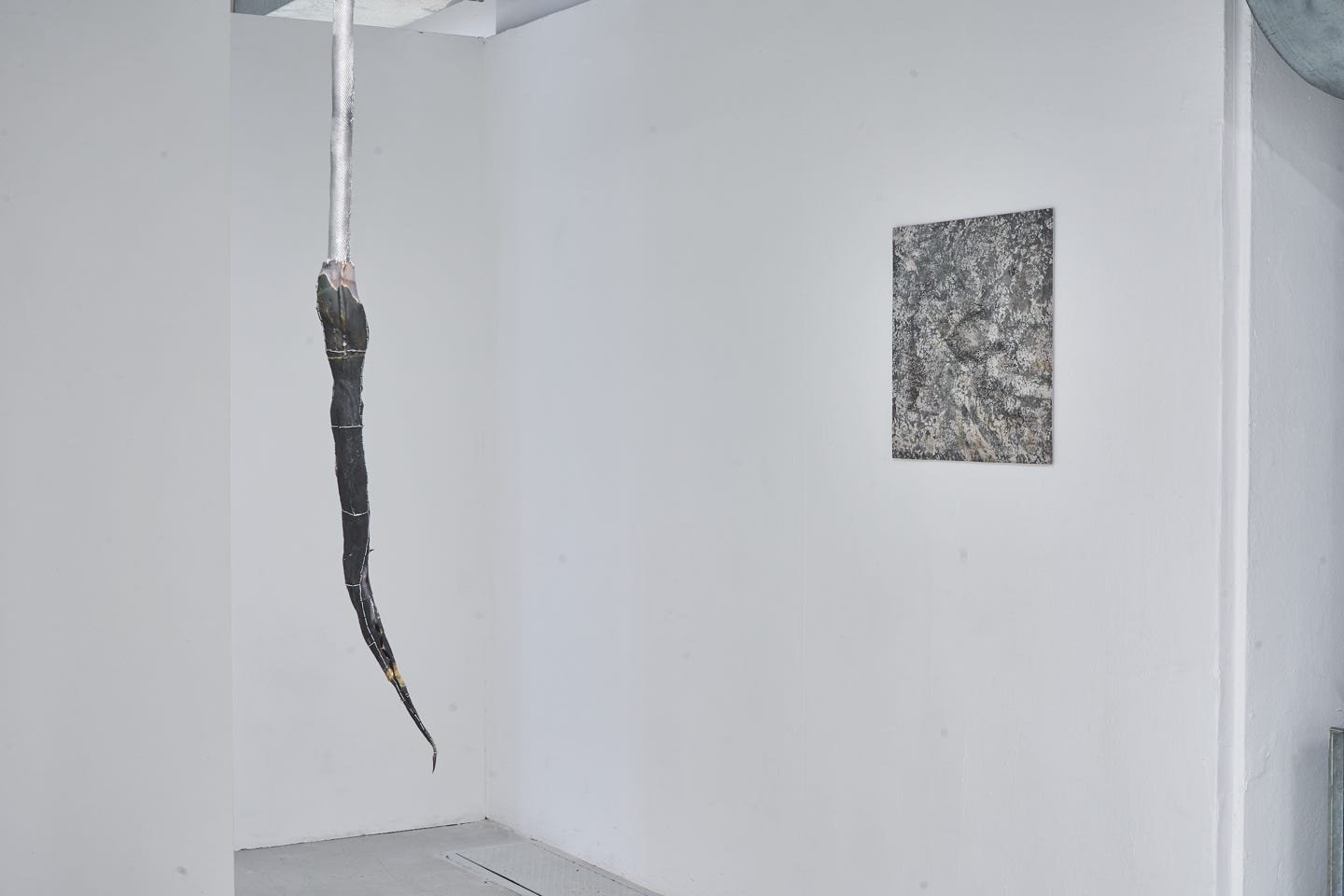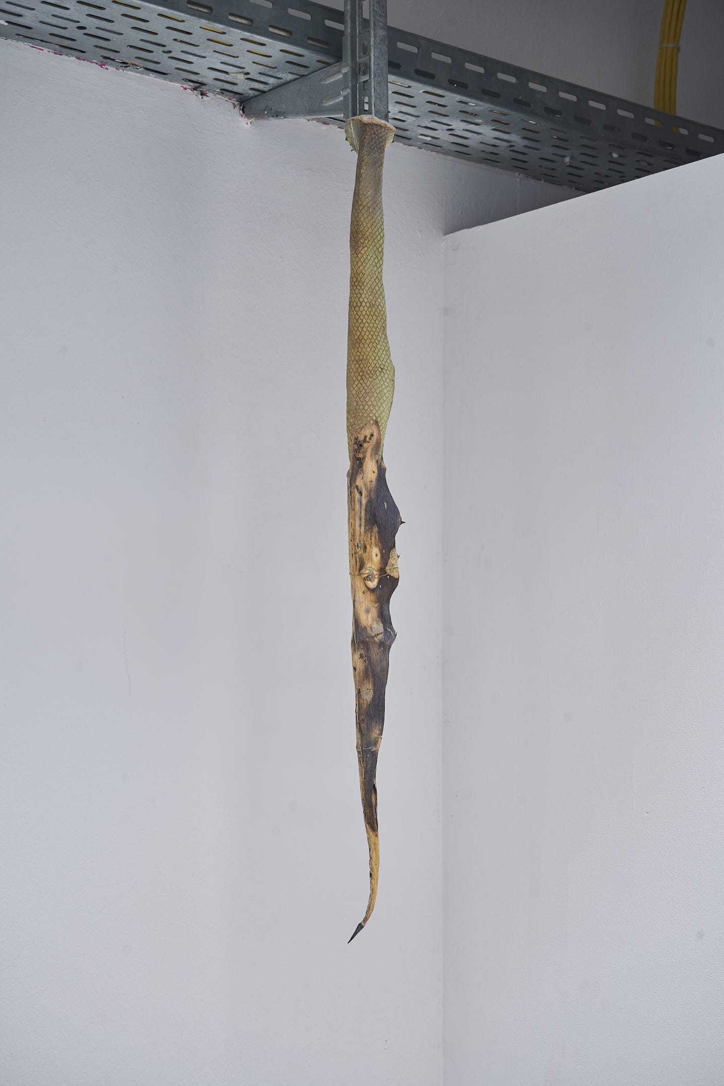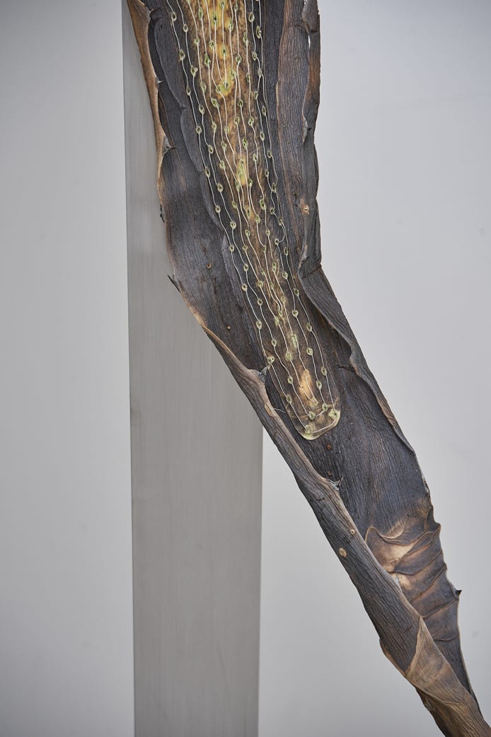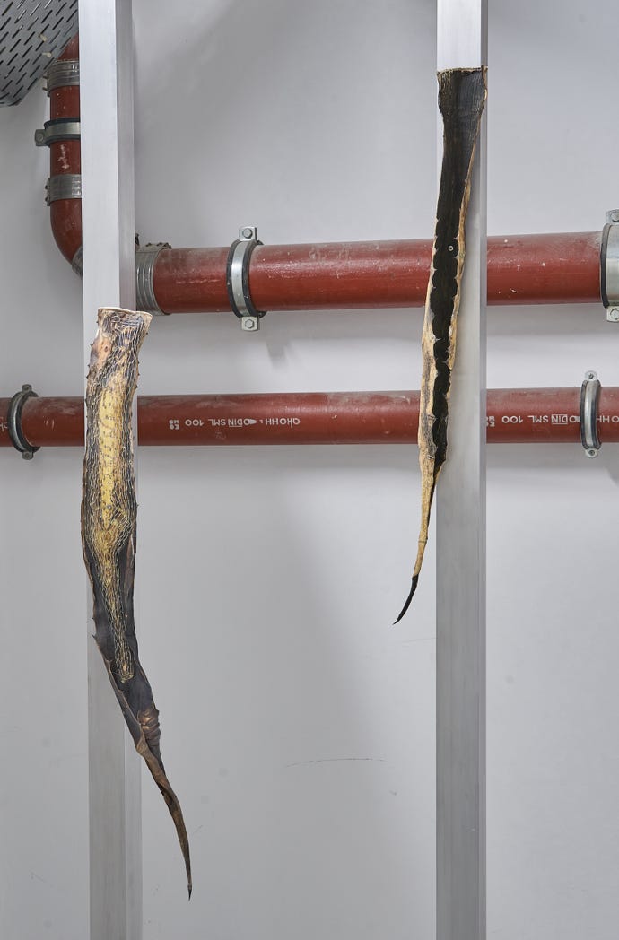 Der Titel „all forms modify their context” basiert auf dem Verständnis, dass jegliche Existenz ihre Umwelt beeinflusst und wiederum selbst beeinflusst wird. So wirkt die Agave als skulpturales Element ebenso auf die Rezipient:innen ein, wie sie als wachsende Pflanze ihre Umgebung in Südfrankreich prägte.* Der Kontext verschiebt sich, und sie tritt in der Installation in Verbindung mit dem Raum, seiner Infrastruktur und anderen Materialitäten. Die Pflanzen werden zu hybriden Wesen, die, losgelöst von ihrem Ursprung, beginnen, sich zu transformieren und sich an eine kühle, industrielle Umgebung anzupassen. Begleitet werden sie von Videoarbeiten, Zeichnungen und Skulpturen, die die Wechselwirkungen zwischen menschlicher Präsenz, natürlicher Umgebung und deren kontinuierlicher Veränderung hervorheben.