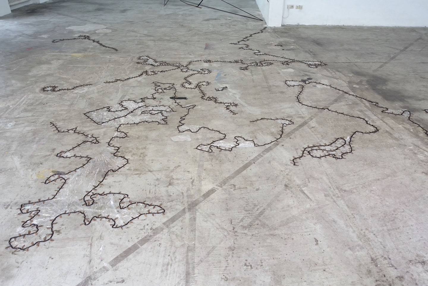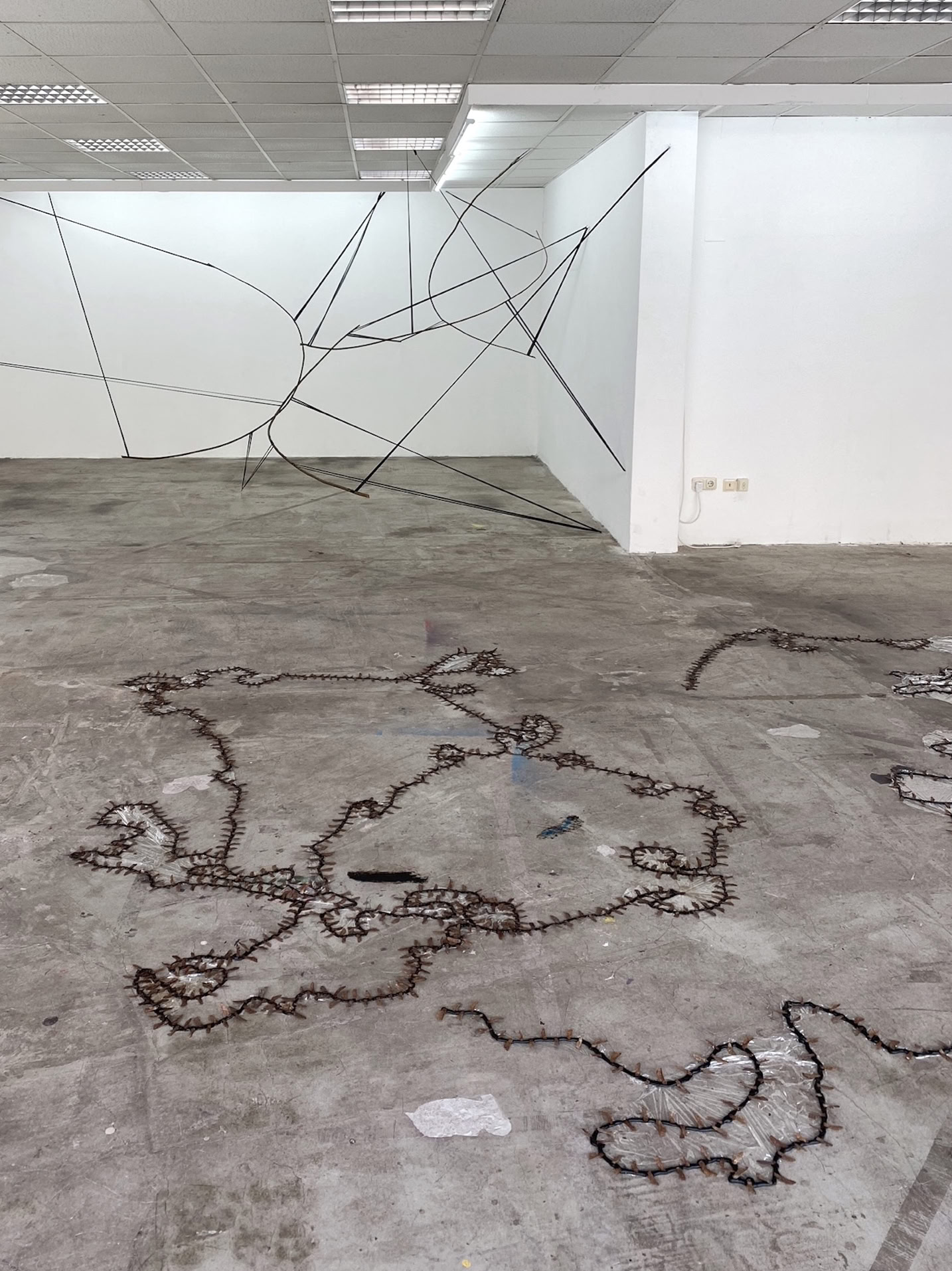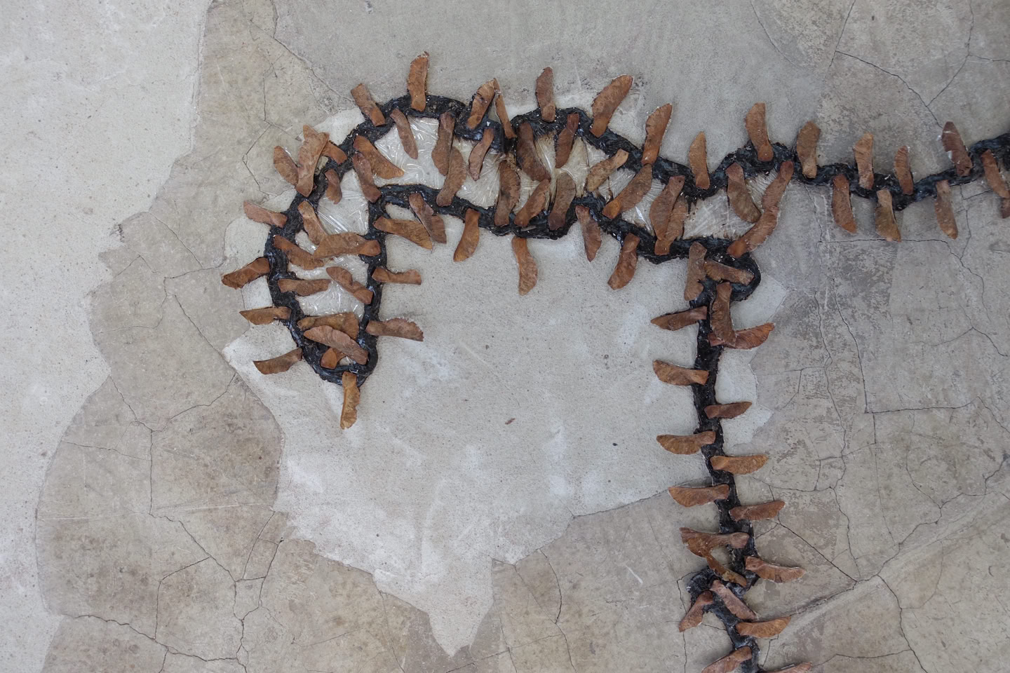 “cicatrix” is a site-specific installation made of bitumen and maple seeds that finds its way through the existing architecture like a living organism. It addresses the extensive sealing of surfaces in urban development, which leaves hardly any space for plants. “cicatrix” plays with micro and macro levels, looks like a landscape or scar from a distance and reveals its material composition on closer inspection.