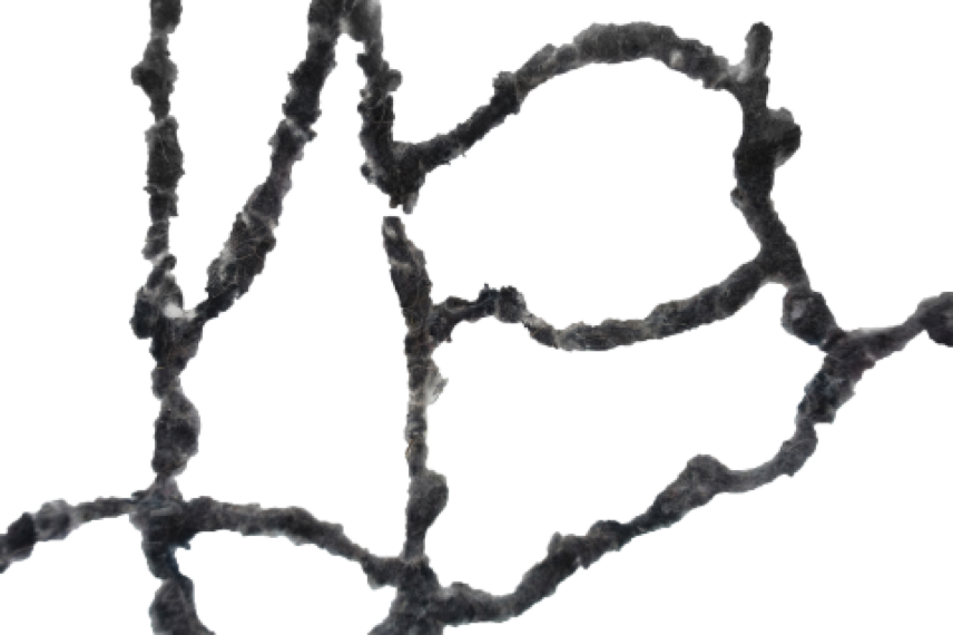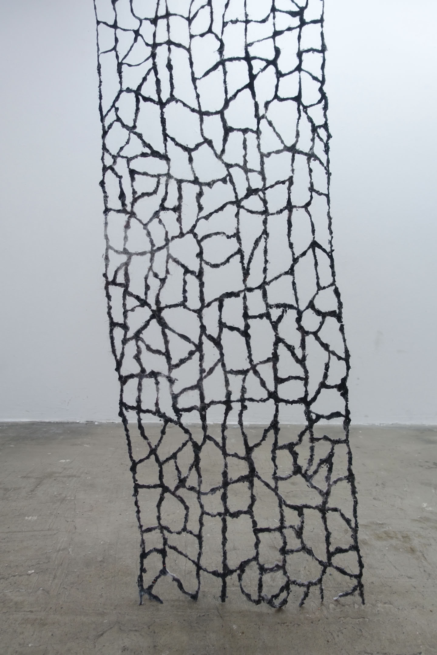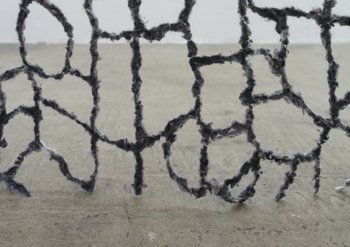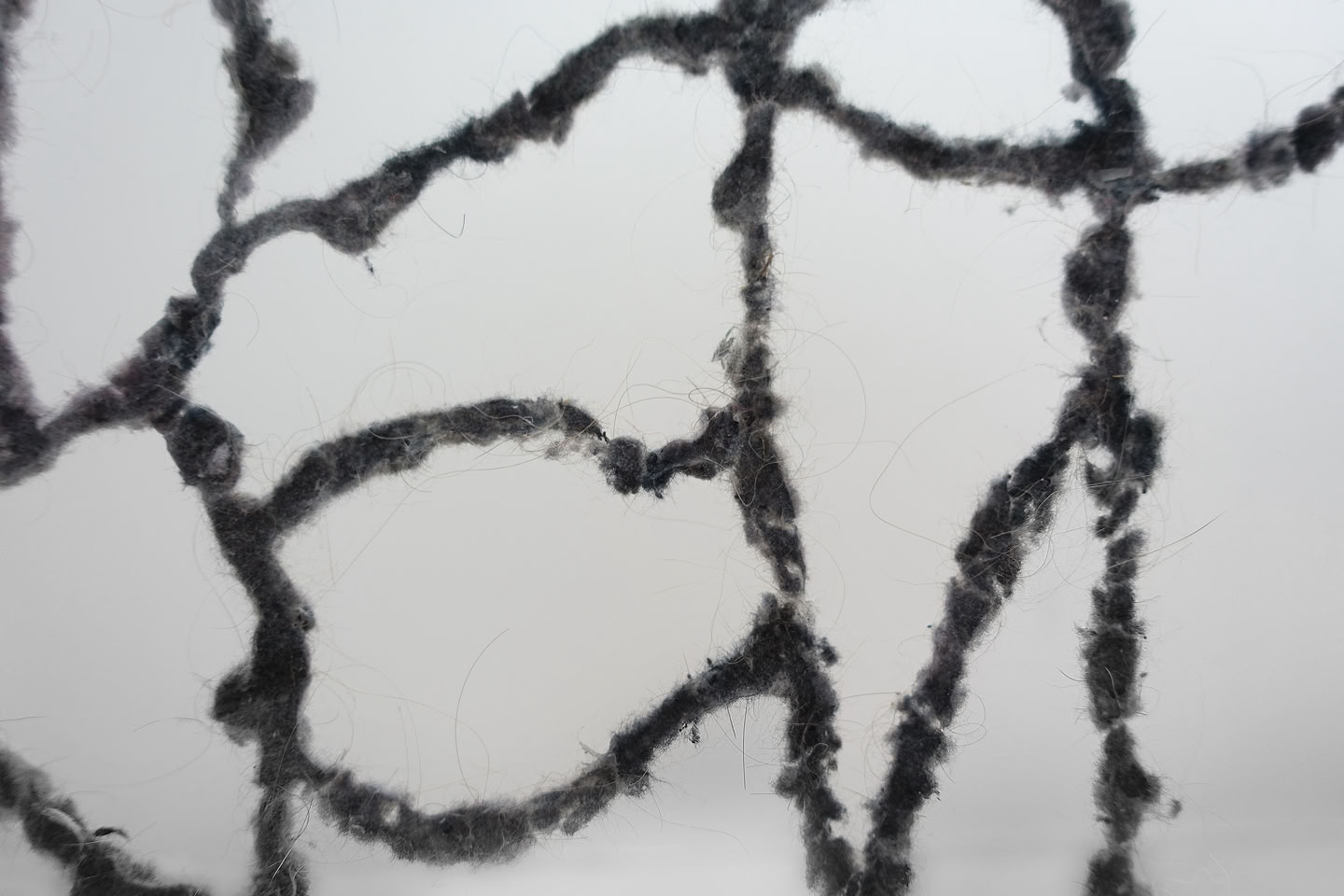 “entlarven” is a structure made of collected dust and textile fibers that hang in the room like enlarged cells. Looking solid and stable from a distance, on closer inspection the sculpture turns out to be a mass of fine particles that seem to dissolve. Dust is omnipresent, originating from both natural sources (e.g. wind erosion, volcanic eruptions, dust storms) and anthropogenic sources (e.g. mining, combustion processes). It can settle as aerosols not only on surfaces but also in bodies. In addition to dust, fibers, hair, feathers and other tiny materials are also part of the structure, thus drawing attention to these smallest elements.
