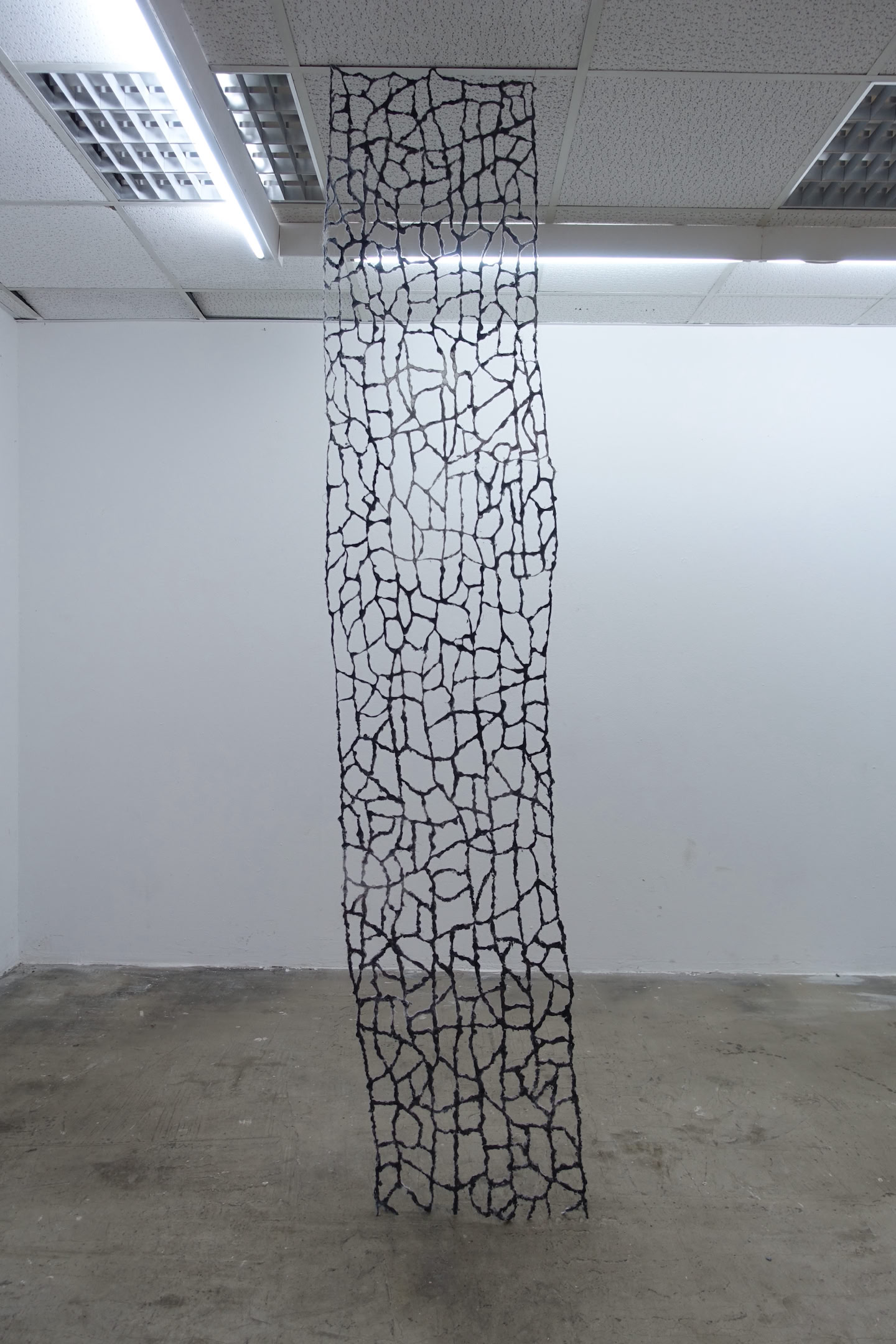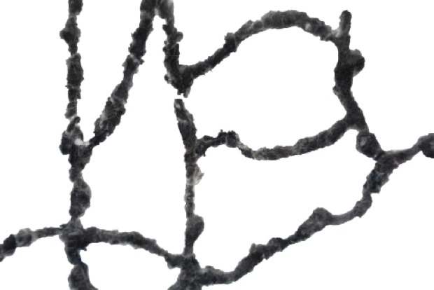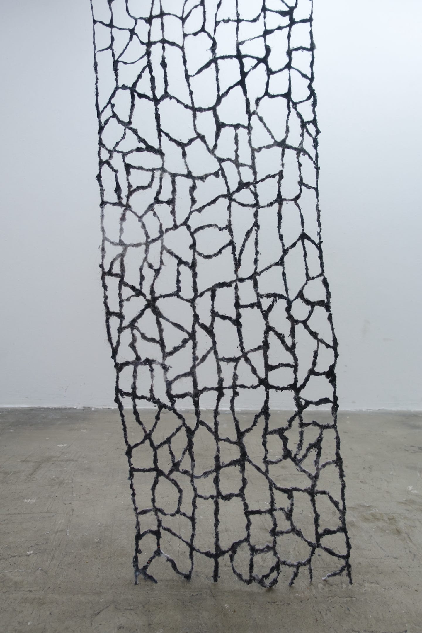 „entlarven“ ist eine Struktur aus gesammeltem Staub und Textilfasern, die wie vergrößerte Zellen im Raum hängen. Aus der Ferne fest und stabil wirkend, entpuppt sich die Skulptur bei genauerer Betrachtung als Masse aus feinen Partikeln, die sich aufzulösen scheinen. Staub ist allgegenwärtig, entstammt sowohl natürlichen Quellen (z.B. Winderosion, Vulkanausbrüche, Staubstürme) wie auch anthropogenen Quellen (z.B. Bergbau, Verbrennungsprozesse). Er kann sich als Aerosole nicht nur auf Oberflächen, sondern auch in Körpern festsetzen. Neben Staub sind auch Fasern, Haare, Federn und andere winzige Materialien Teil der Struktur und lenkt somit die Aufmerksamkeit auf diese kleinsten Elemente.