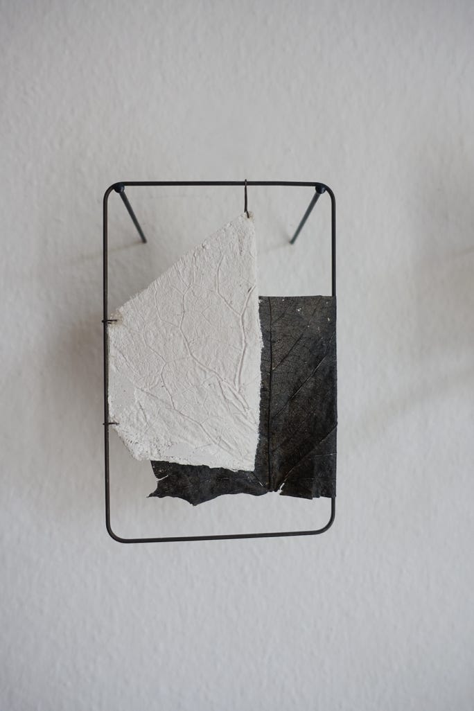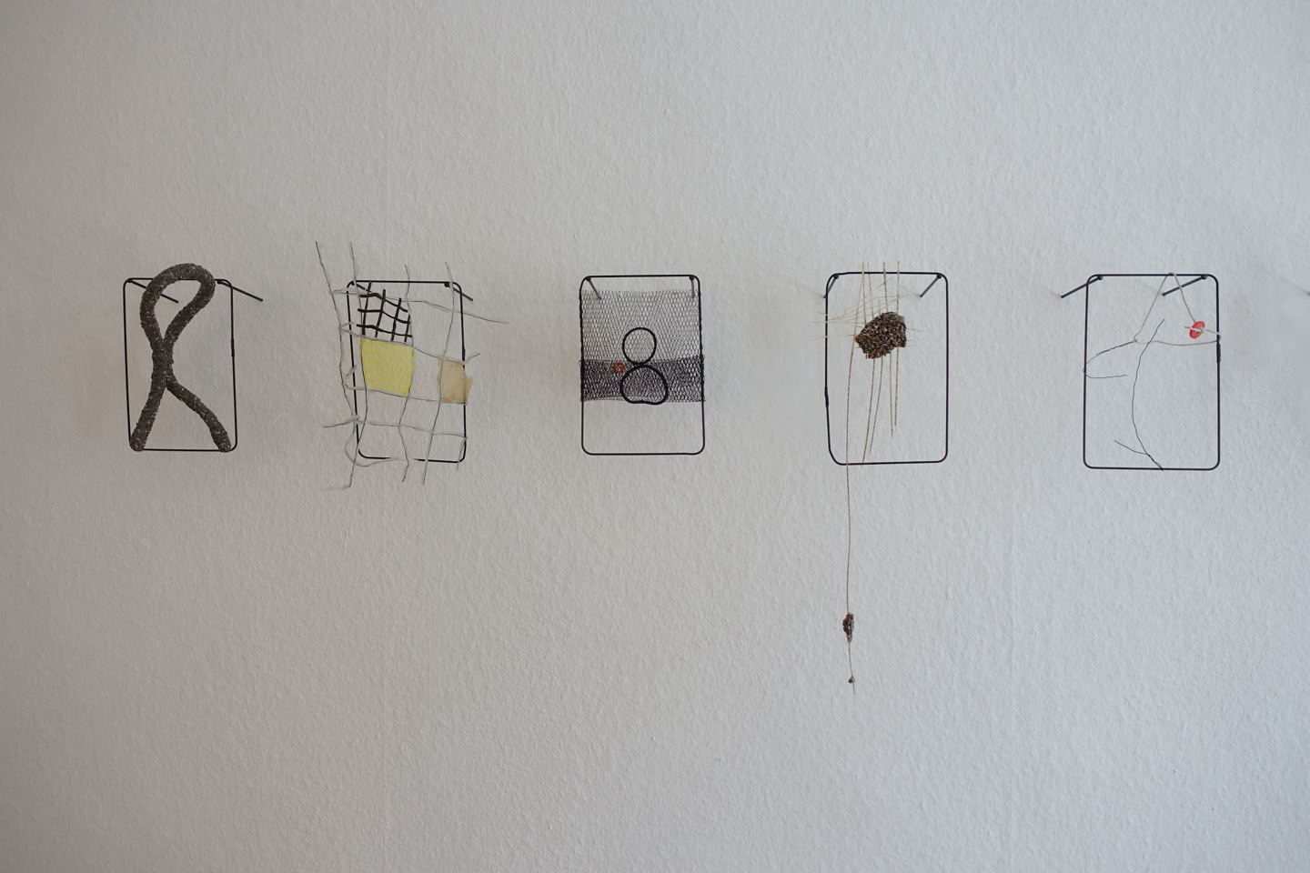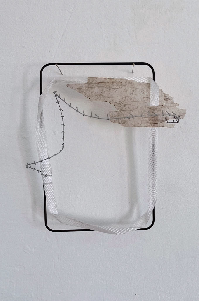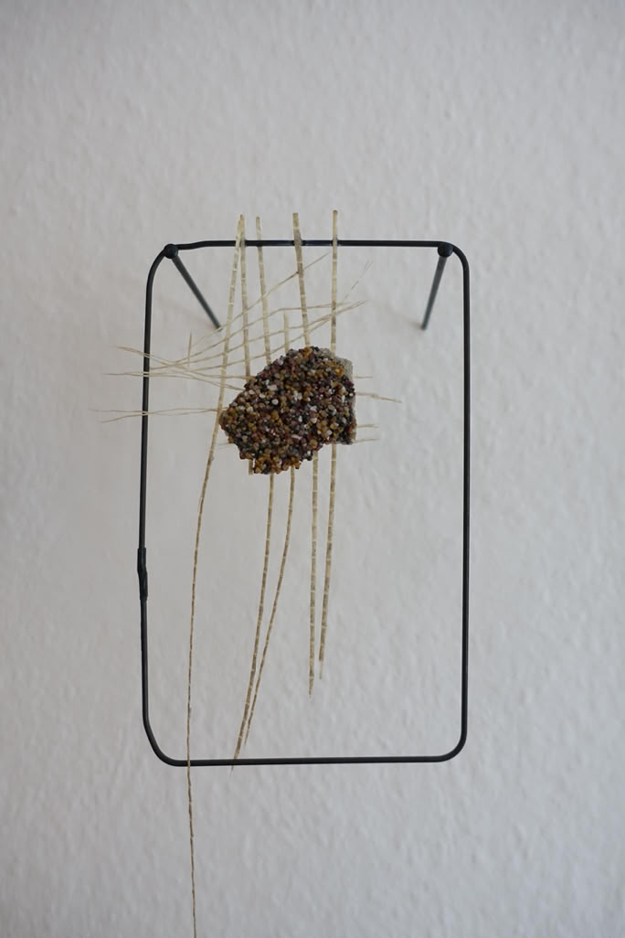 Die Serie „formative escape“ entstand aus dem Gedanken heraus Materialstudien und gefundene Objekte in ein archivarisches Format einzubetten. Das Format des Rahmens ermöglicht ein hierarchieloses Nebeneinandersetzen, innerhalb dem ein freier assoziativen Umgang möglich wird. Aus diesem praktischen Ansatz heraus entstanden eigenständige Kompositionen, die zarten Materialien und kleinteiligen Elementen Raum und Aufmerksamkeit geben.