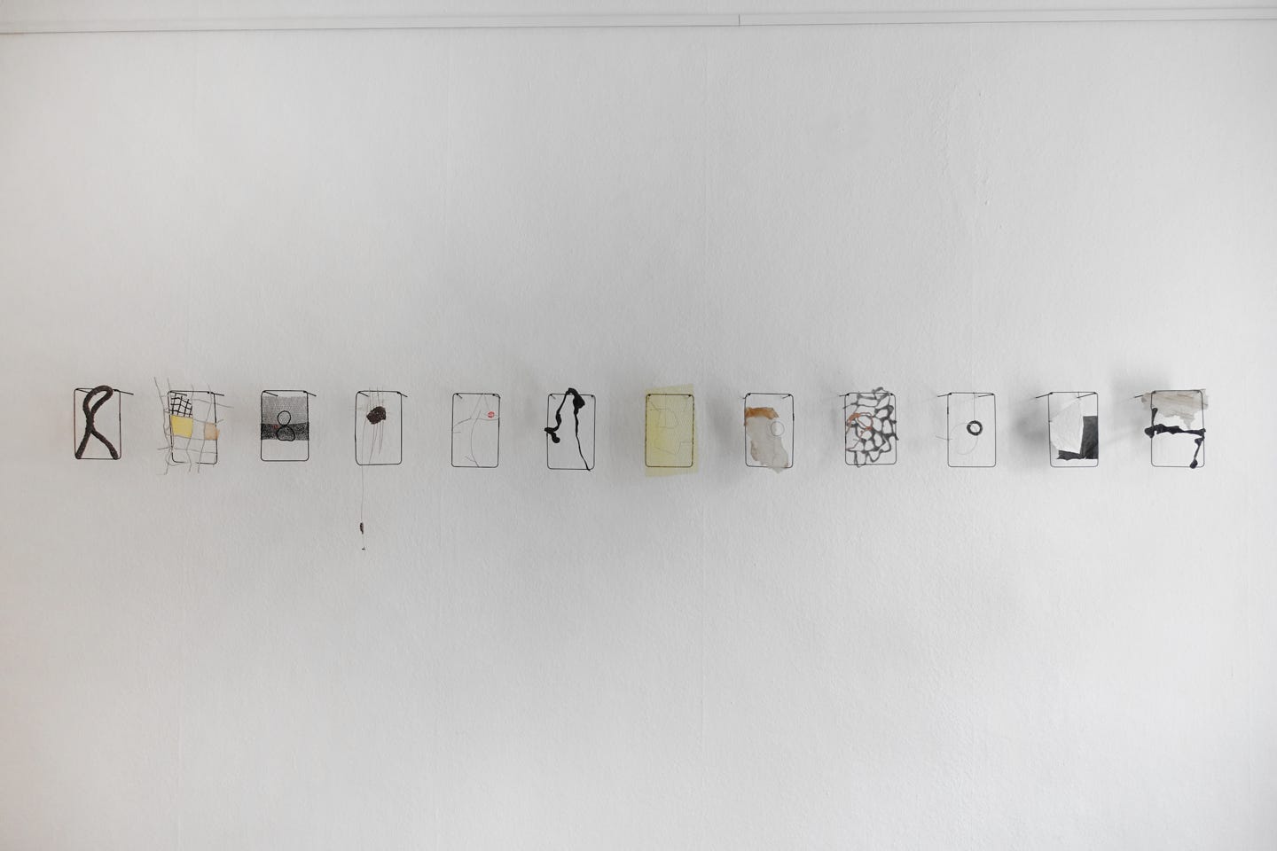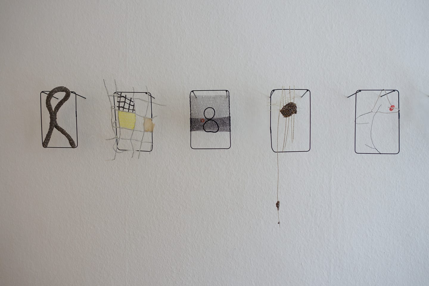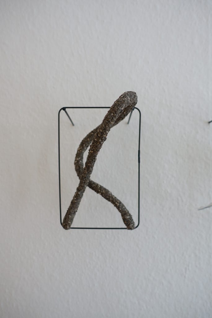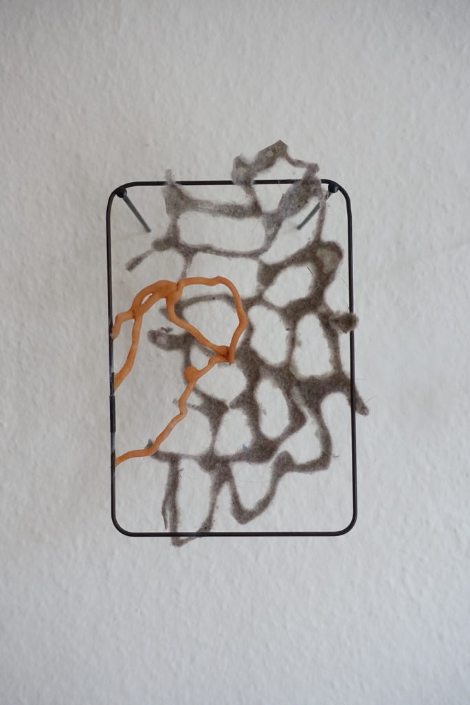 Die Serie „formative escape“ entstand aus dem Gedanken heraus Materialstudien und gefundene Objekte in ein archivarisches Format einzubetten. Das Format des Rahmens ermöglicht ein hierarchieloses Nebeneinandersetzen, innerhalb dem ein freier assoziativen Umgang möglich wird. Aus diesem praktischen Ansatz heraus entstanden eigenständige Kompositionen, die zarten Materialien und kleinteiligen Elementen Raum und Aufmerksamkeit geben.