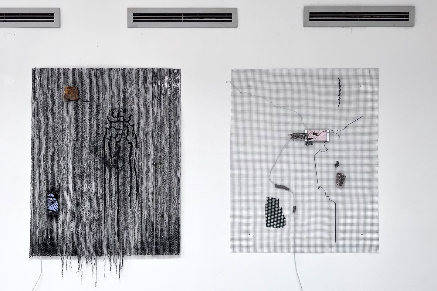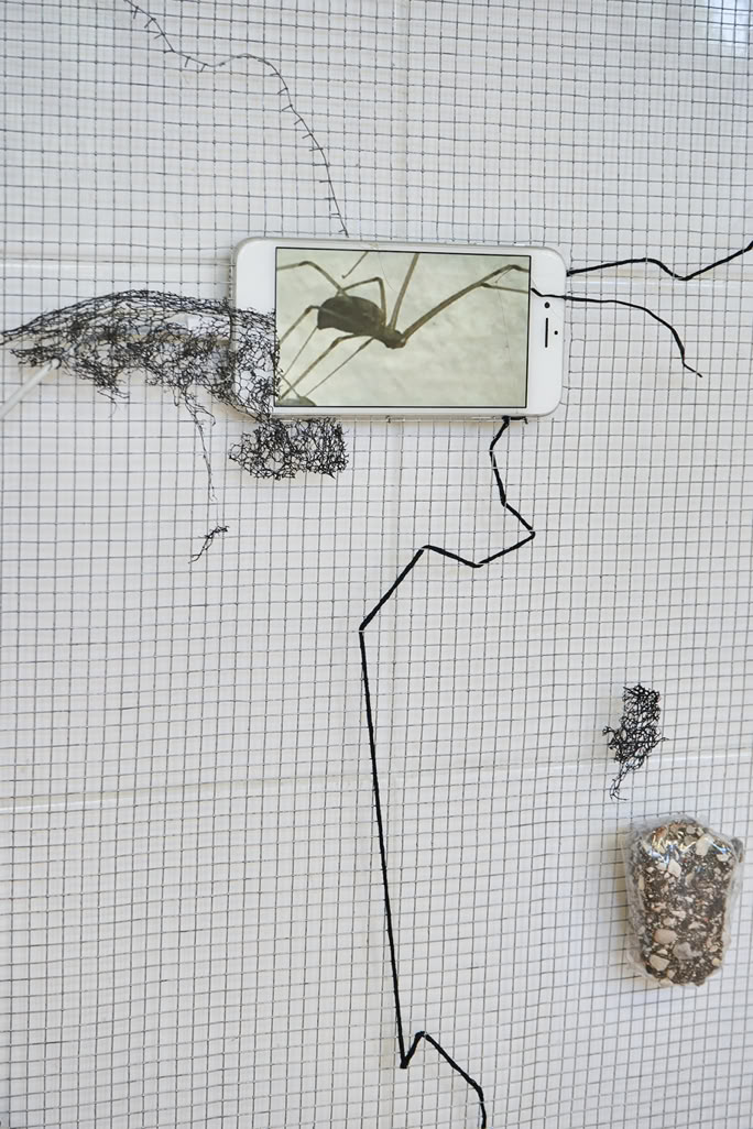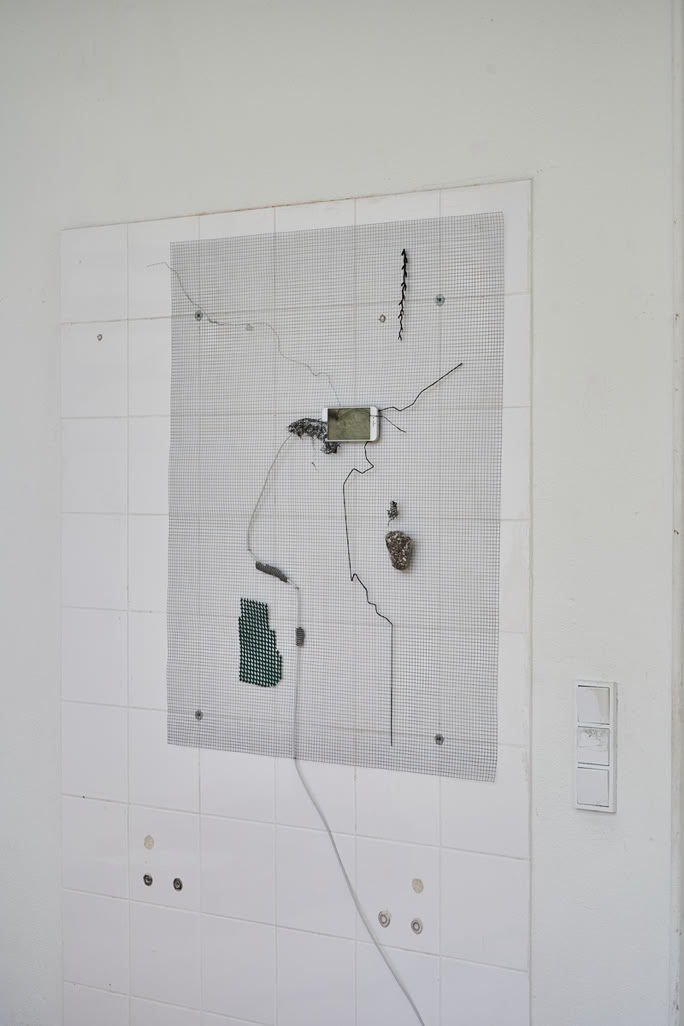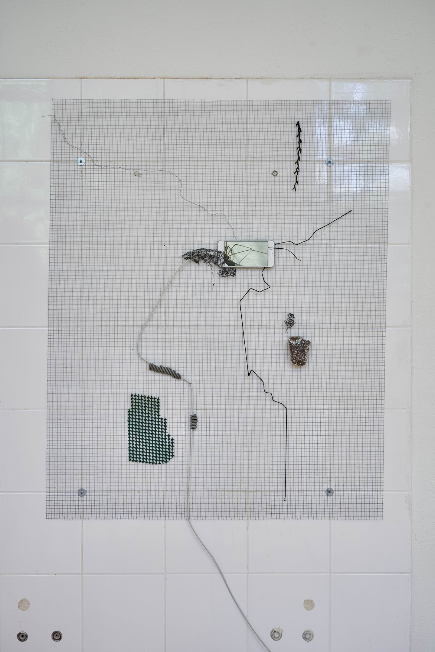 As a symbol of human systems of order used to classify, organize, and explore their environment, metal grids form the starting point of the wall works. The grid hints at cartographies and digital image spaces in which objects float without anchoring, suspended between macro and micro perspectives. Movements from the videos are picked up by lines beyond the screen, creating a seamless transition between moving images and static assemblages. Video, image, and sculpture merge, while concepts such as nature and culture, organic and inorganic, human and more-than-human enter into a dialog.
