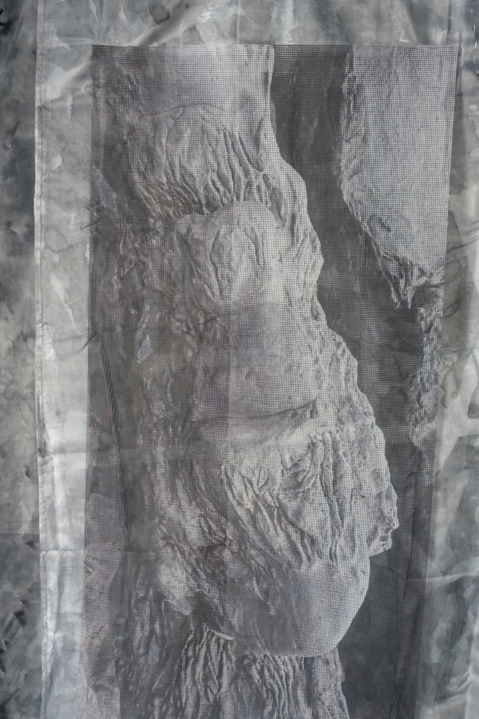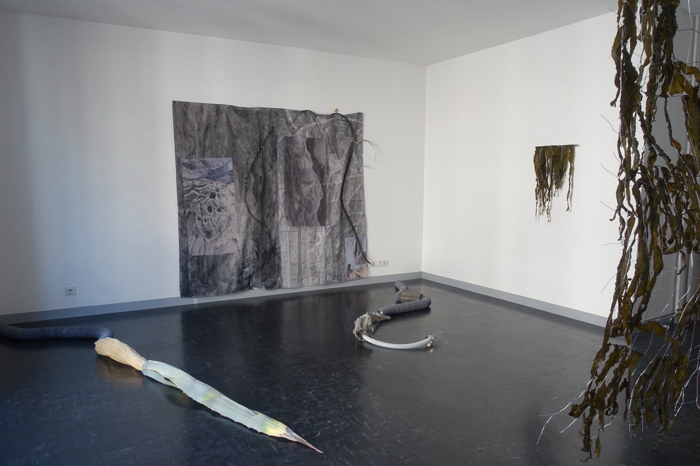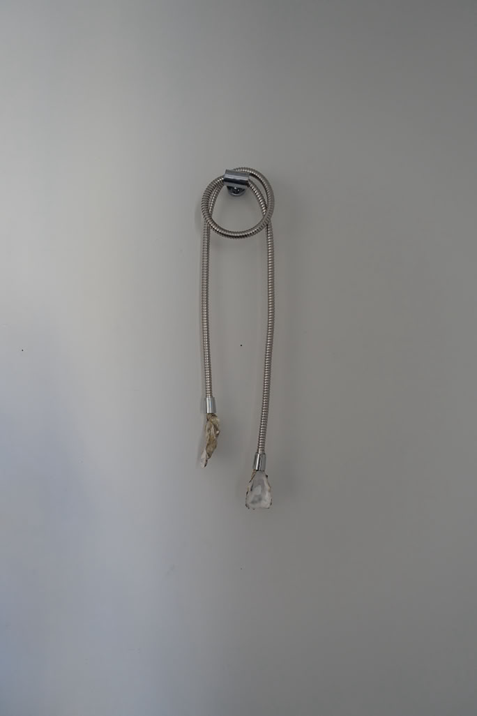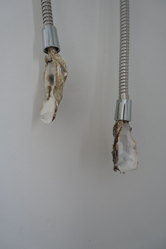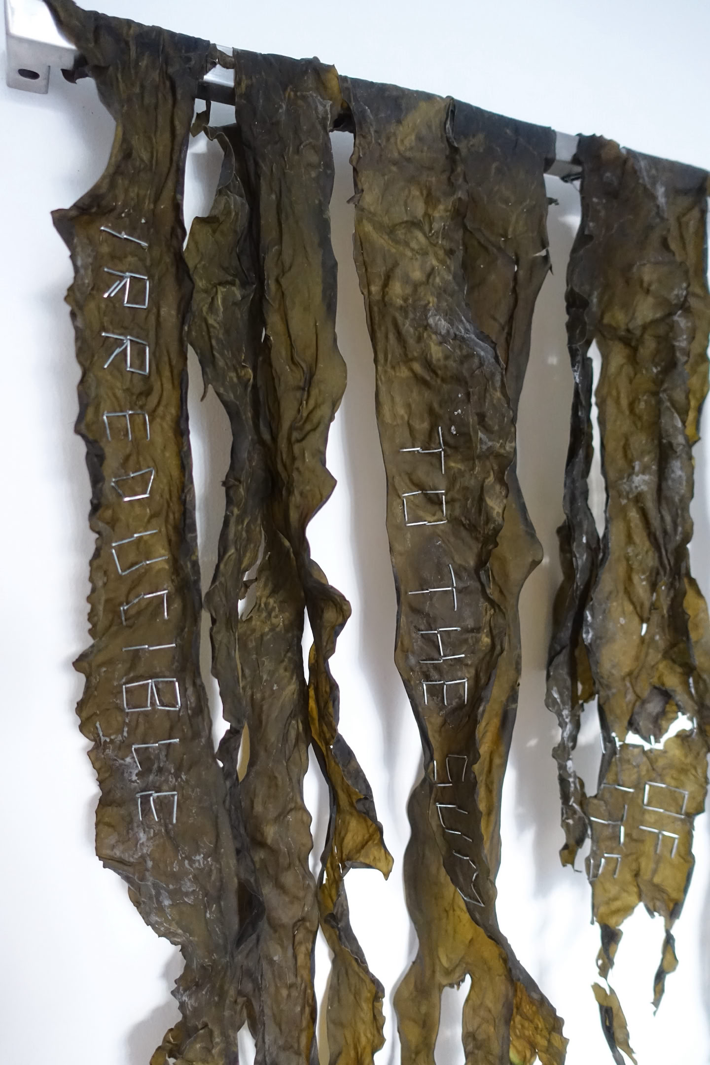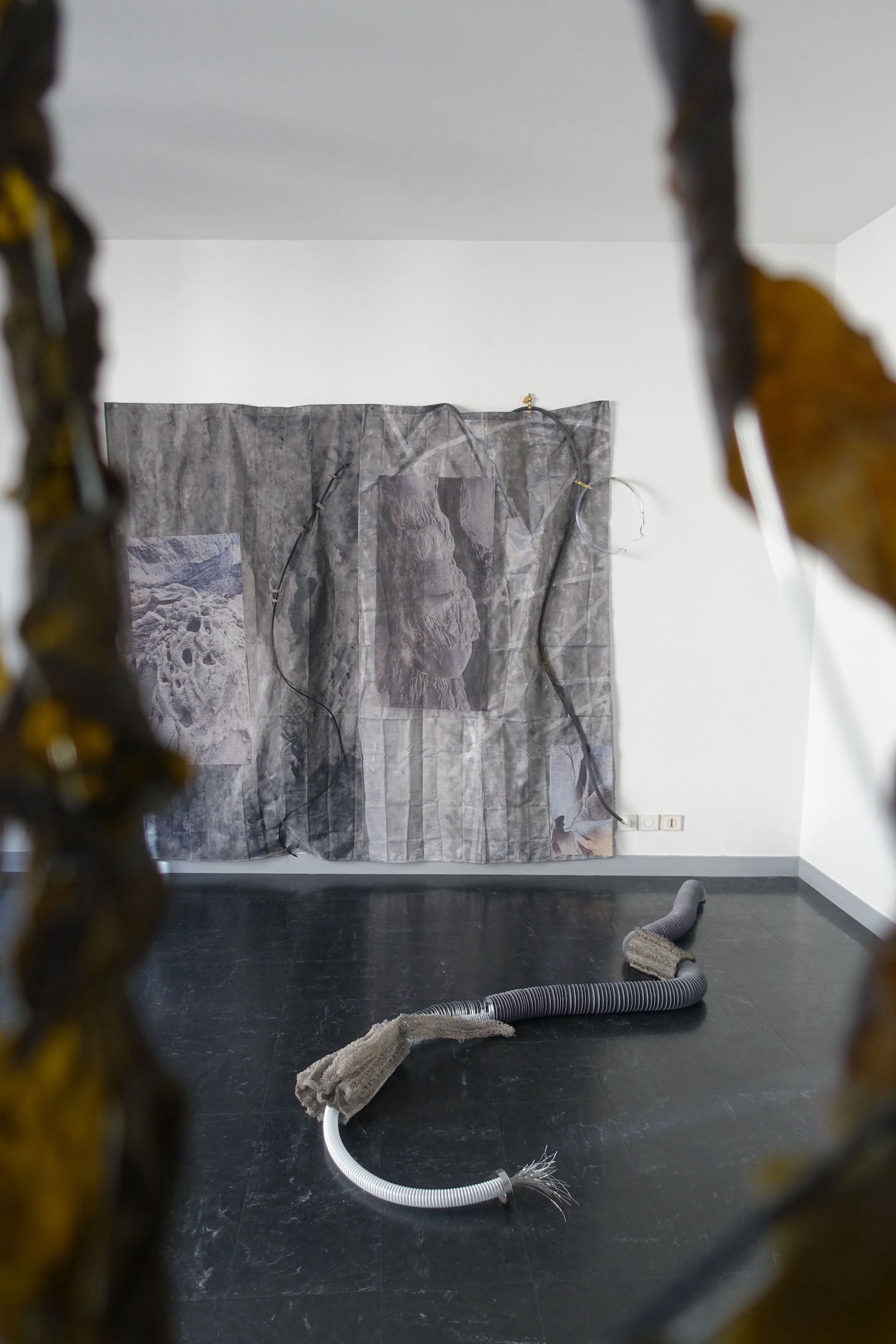 The installation “metastable waters, made in 2024, was created as part of the EIB’s Artists Development Programme. Weiss began by researching deep sea mapping and scientific ways to approach the deep. With the artist’s lifelong fascination with this alien terrain, she was excited by the possibility of new species discoveries; but she was also concerned about the risks of deep sea mining. Out of her research, Weiss produced a body of works that explore our relationship with water. The metal structure represents deep sea mapping. Grids are a recurring theme in Weiss’s practice. Weiss says, “I am interested in how we humans perceive the world and try to make it comprehensible for ourselves. We create structures to try to make order. But I am not sure if it is possible to situate all knowledge in a grid.” This is particularly true of the deep sea, an incomprehensibly vast landscape that humans have divided into more digestible squares. Through her work, Weiss encourages us to acknowledge and perhaps challenge the grid, allowing it to become a little less rigid. Weiss’s metal grid is dripping with seaweed, a material often found on the ground and on the surface of the ocean. Weiss captures the tension between the surface and the depth; between materials that we can grasp and bodies of knowledge that we cannot comprehend. Seaweed, in this case kelp from the Atlantic, is an important material in Weiss’s oeuvre. She explains: “seaweed is going to become more and more important in our lives: it has important carbon absorption properties; it is a natural fertiliser; and it serves as food.” Reflecting on her seaweed works, the artist says, “The metal and the seaweed do not fight against each other; they become one. We cannot separate the human-made and the natural. They merge and become something else.” During her residency, Weiss also questioned how people engage with water in large cities that are far from the ocean. Once again, the human body entered her work, even if in invisible ways. She embarked upon a playful exploration of showers: shower curtains, shower heads, and even soap dishes. These works are infused with a sense of hope, as they turn the shower into a space ripe for connection with the natural world. Weiss paraphrases Bodies of Water by Astrida Neimanis: “All living things are bodies of water: humans, seaweed, agaves, we are all bodies of water. All we are doing is exchanging water between us.” Stapled into Weiss’s seaweed, one can see the text, “IRREDUCIBLE TO THE SUM OF ITS PART.” This is how Weiss invites us to see the natural world, as something connected with all things, including us.
