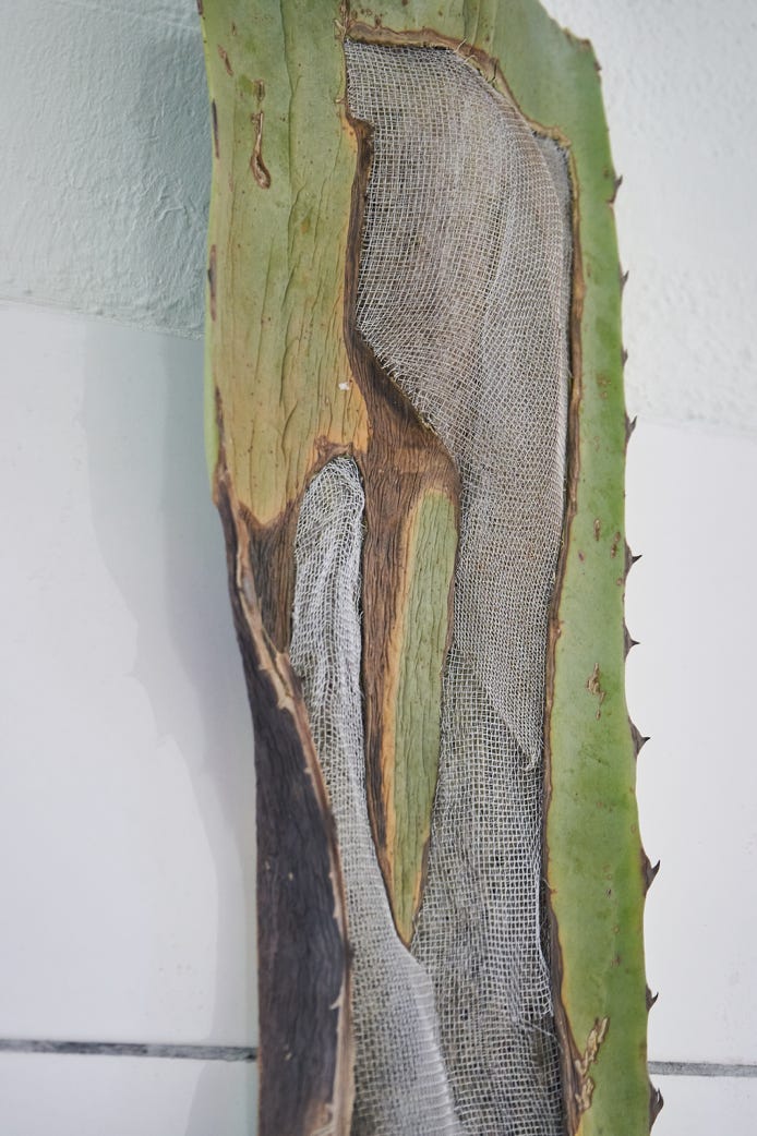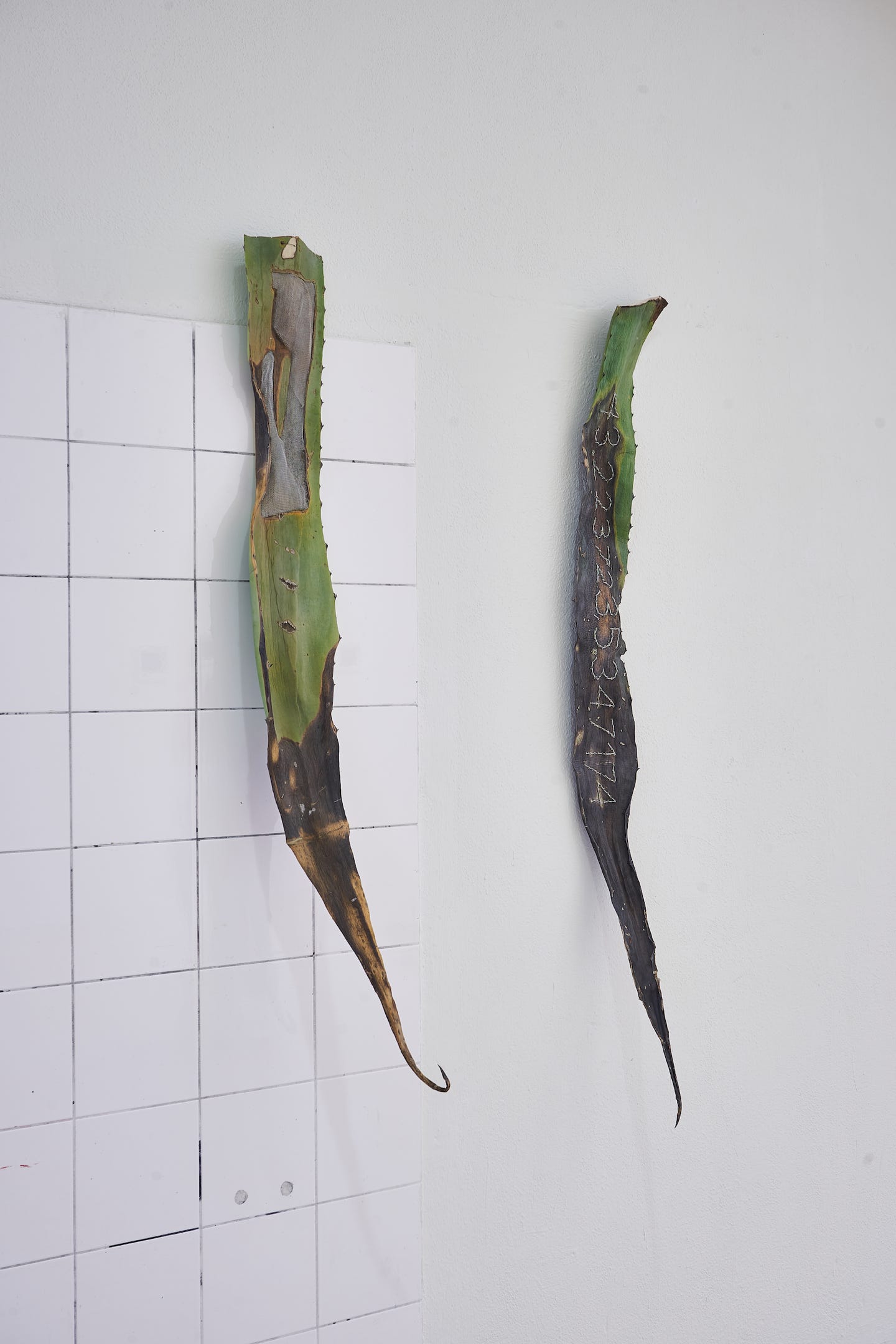 “species from afar” is an investigation of the human systems developed to categorize landscapes. A surgical procedure was carried out on two agave leaves: The coordinates of the plant's place of growth and death were embroidered into one leaf. To create maps, the earth was systematically cartographed and meticulously gridded, coordinate systems were created in order to be able to provide universal location information using number systems. This type of appropriation of the world by humans forms the basis of global systems and is based on the assumption that plants, animals and other non-human actors can be recorded and controlled.