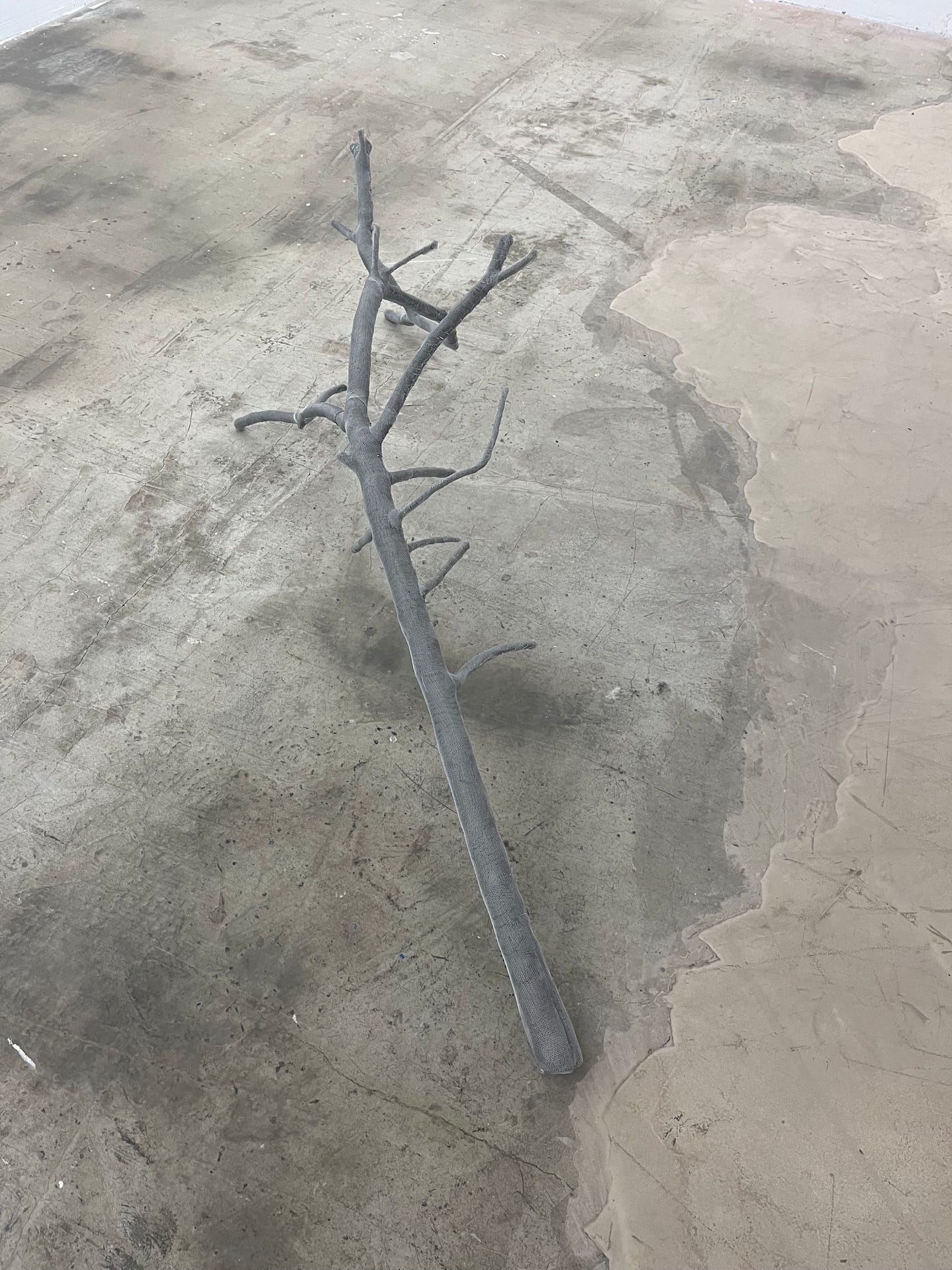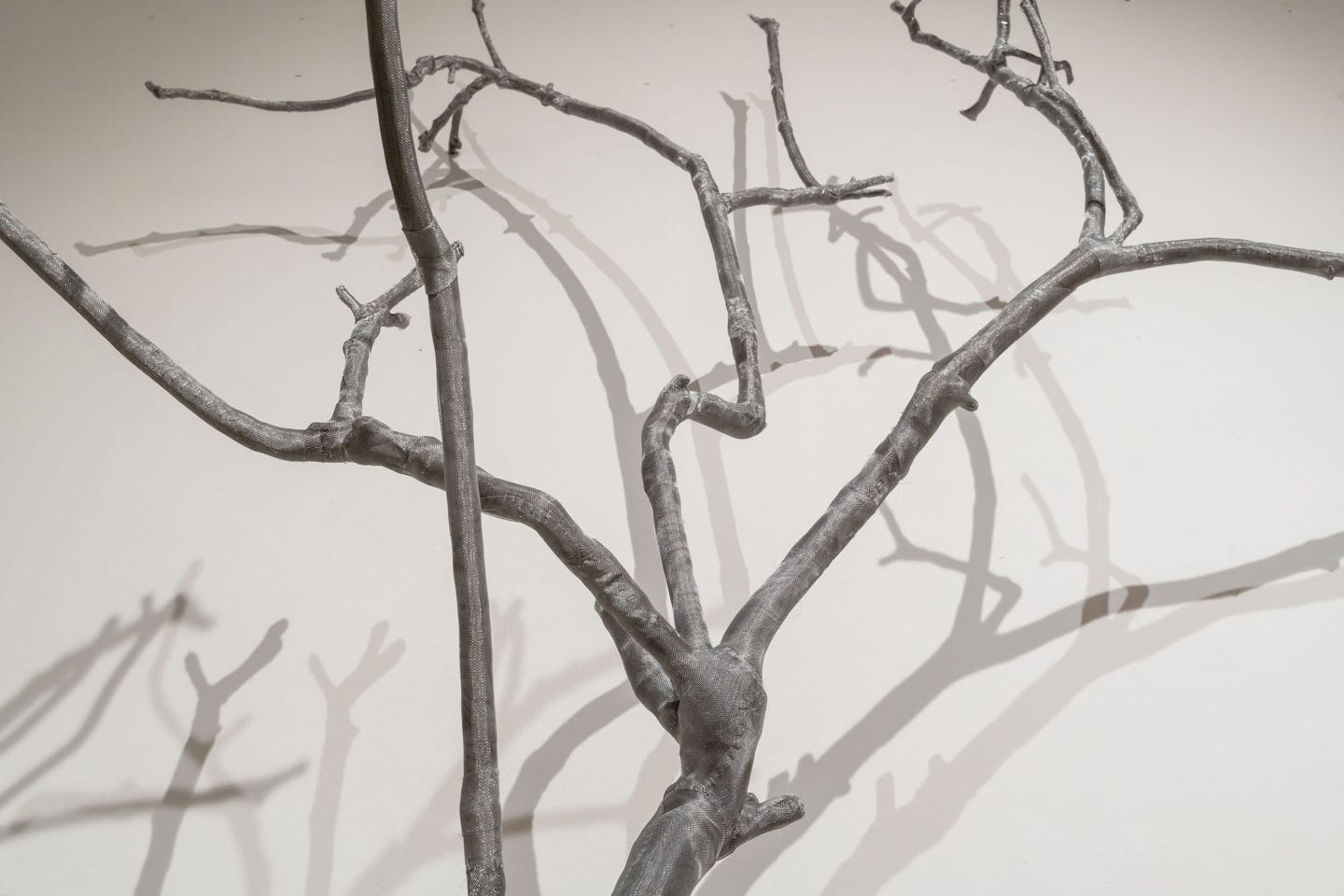 „unknown source [viburnum]“ ist ein etwa 5 Meter hoher Baum, der bei einem Sturm gefallen ist und dem sich Maxine Weiss annimmt. Sie bandagiert und fixiert ihn mit Aluminiumgewebe und Tackerklammern. Das Tackern hat für die Künstlerin eine stark körperliche Komponente, vergleichbar mit dem Verschließen von Wunden, die geklammert oder genäht werden. Weiss betrachtet den Baum als eigenständigen Körper, der durch die Umhüllung mit dem metallischen Gewebe zu einem hybriden Wesen wird – einem Körper, der erzählerisch auf neue Weise wachsen kann. Je nach Lichteinfall beginnt die Oberfläche des Baumes zu interferieren und zu flimmern, was ihm eine digitale Anmutung verleiht, ähnlich einer Simulation, einem Rendering oder einem Glitch. Besonders interessiert Weiss die Durchdringung von organischen Elementen, synthetischen Stoffen und der digitalen Welt – Komponenten, die nicht unabhängig voneinander existieren, sondern sich in der Zukunft möglicherweise weiter vermischen und neue Formen des Daseins schaffen werden.