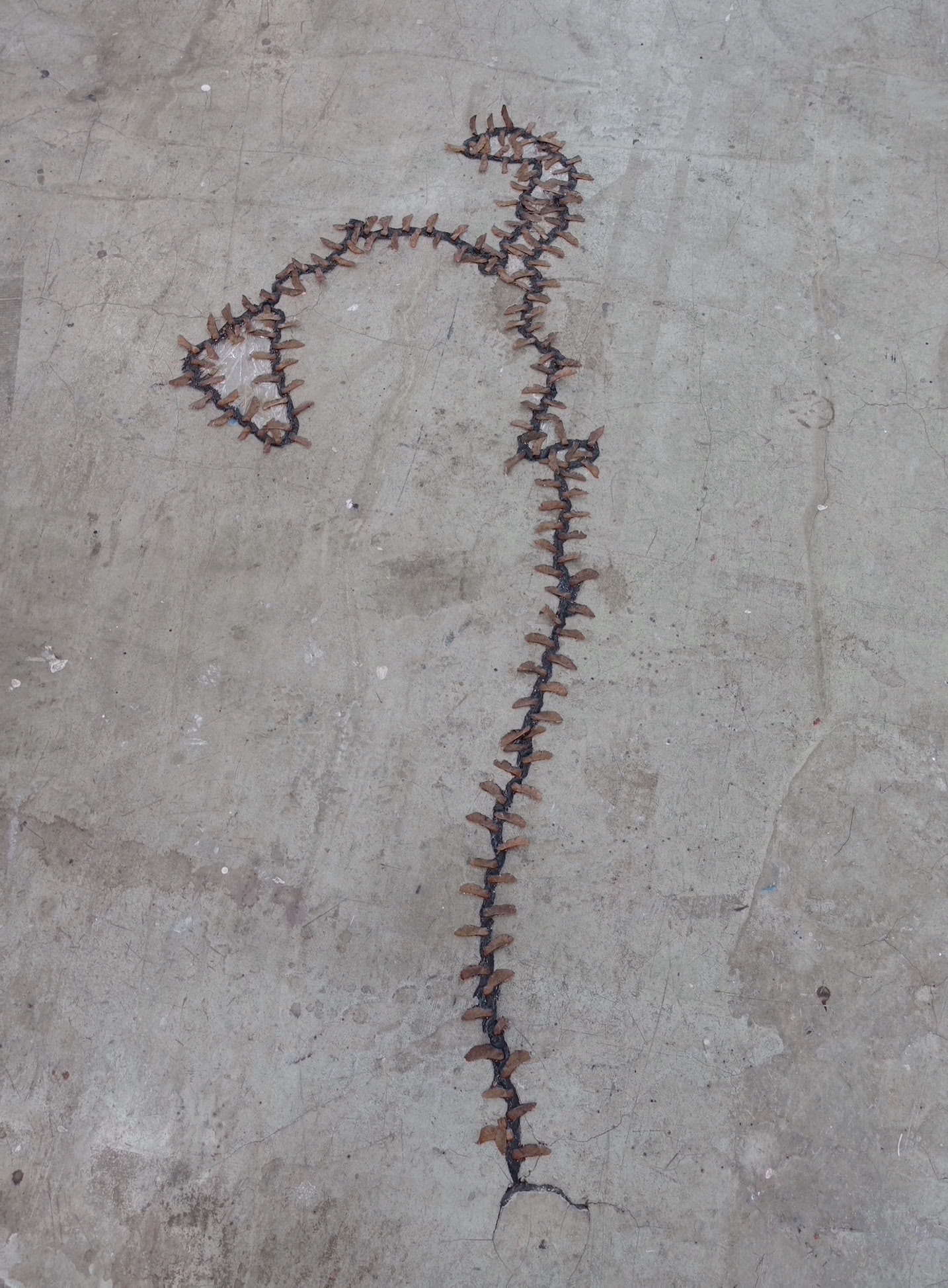 „cicatrix“ ist eine ortsspezifische Installation aus Bitumen und Ahornsamen, die sich wie ein lebendiger Organismus ihren Weg durch die bestehende Architektur bahnt. Sie thematisiert die weitreichende Versiegelung von Flächen im urbanen Städtebau, der Pflanzen kaum Raum lässt. „cicatrix“ spielt mit Mikro- und Makroebenen, wirkt aus der Ferne wie eine Landschaft oder Narbe und zeigt offenbart erst bei genauerem Hinsehen ihre materielle Beschaffenheit.