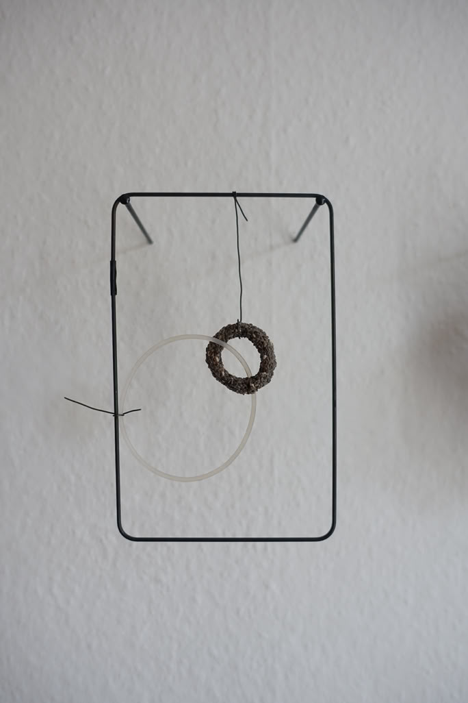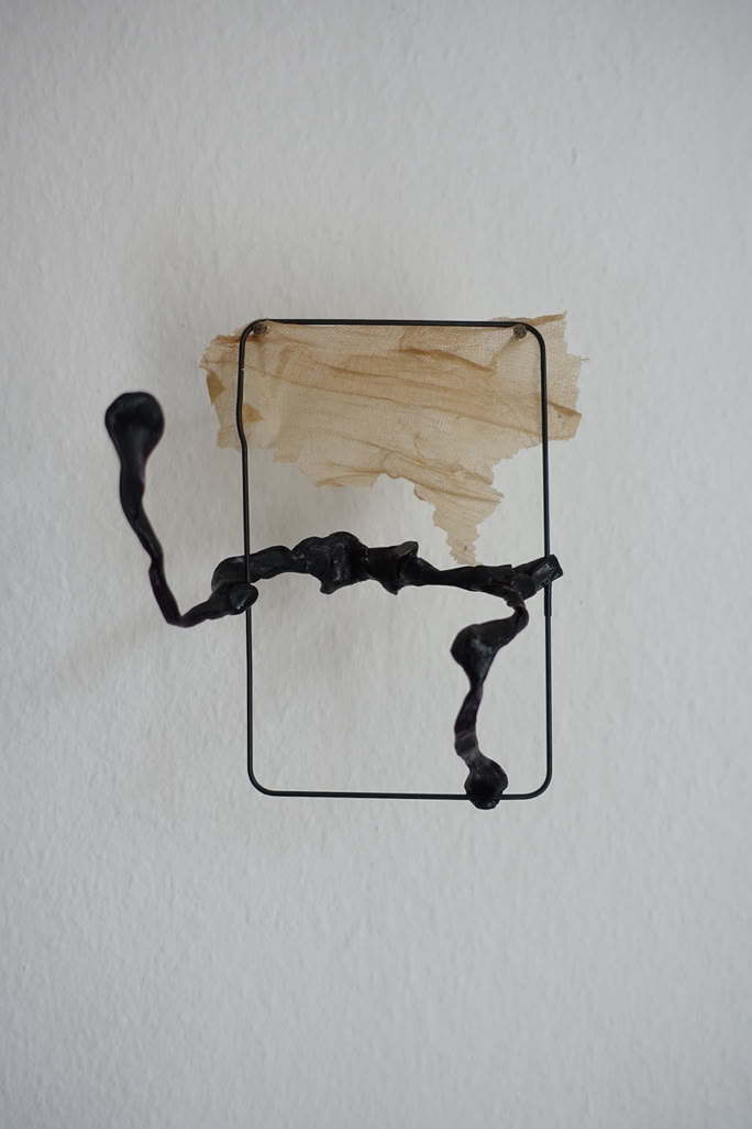 Die Serie „formative escape“ entstand aus dem Gedanken heraus Materialstudien und gefundene Objekte in ein archivarisches Format einzubetten. Das Format des Rahmens ermöglicht ein hierarchieloses Nebeneinandersetzen, innerhalb dem ein freier assoziativen Umgang möglich wird. Aus diesem praktischen Ansatz heraus entstanden eigenständige Kompositionen, die zarten Materialien und kleinteiligen Elementen Raum und Aufmerksamkeit geben.