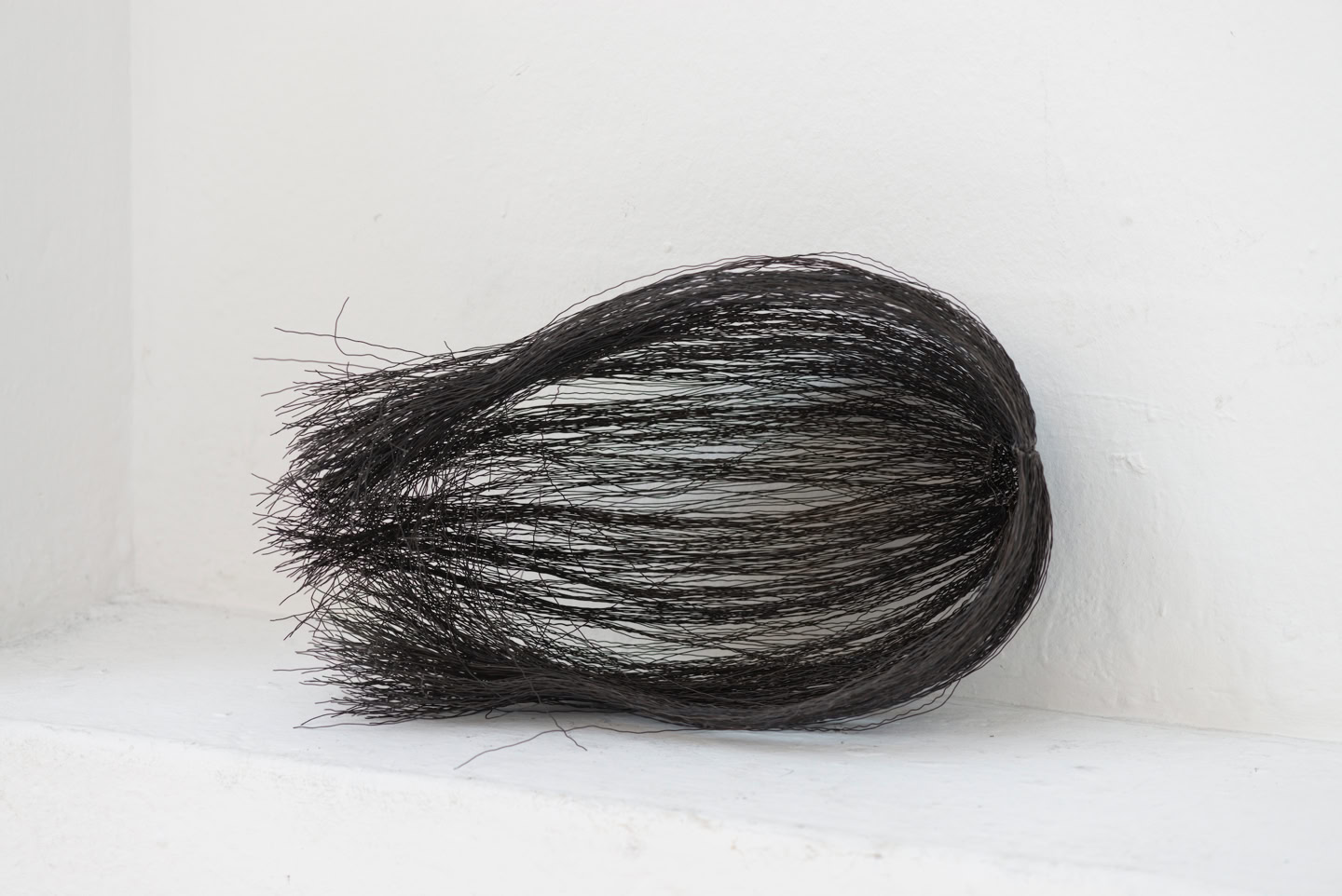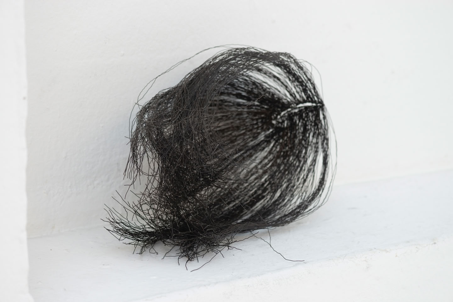 “not listening but I hear you” looks like a hairstyle without a body, as if stripped off, as if left lying around. The sculpture reflects hair as an identity-forming element and encourages us to rethink the image of the body created by the disembodied hair. Hairstyles send signals, mark affiliation, social position, gender roles, they are consciously designed and unconsciously categorized.